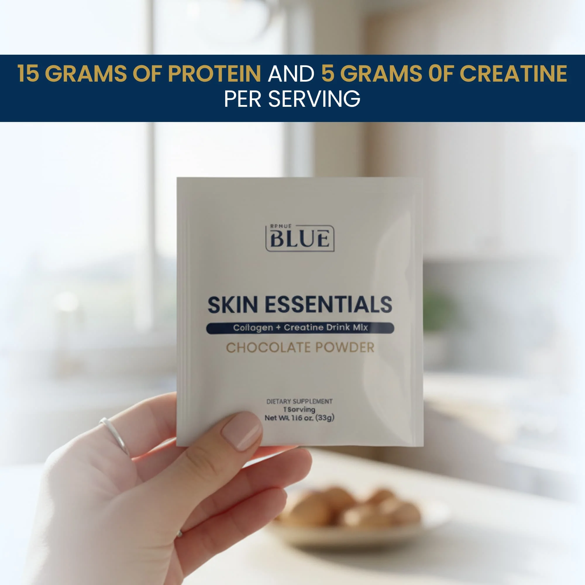 Transform your morning or evening routine into a skincare ritual with our Skin Essentials Chocolate Drink Mix. Packed with 12 grams of collagen, 5 grams of creatine, and 15 grams of protein per-serving, this formulation was custom curated to deliver targeted nutrients that support skin health from within. This powder combines structural proteins, hydration actives, antioxidants, and cellular-support compounds to help maintain hydration, elasticity, and overall skin resilience. Convenient individual sachets make it great for at home or on the go!